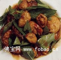 2、油锅烧热,将红椒及姜片爆香,再加入调味料炒香,然后将炸好的洋菇倒入一起拌炒,最后加入九层塔增香即可。