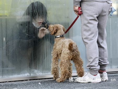 “宝贝你还好吗?”被隔离接收辐射检测的女儿隔着玻璃跟宝贝狗狗打招呼。