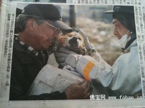 在仙台市若林区,一名消防救难人员救出一只家犬,犬主感动地接过後抱在怀里喜极而泣,狗狗的救命恩人抚摸着狗狗也湿了眼睛。