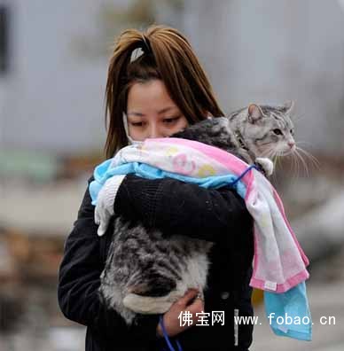2011年3月15日,一位女士抱着爱猫走在仙台湾北部港口被海啸摧毁的街道上。