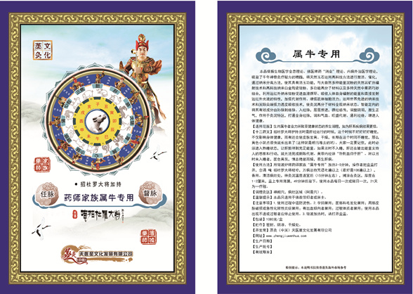 【使用方法】用微波炉将药师家族“属牛专用”加热3~5分钟,操作者把盒盖打开,念诵“唵招杜罗大将 梭哈”咒语七遍以上(最好是108遍以上),备用。清洁病灶处,待灸泥温度适宜后(15分钟左右),摊涂在灸区,厚度在1~2厘米,盖上专用薄膜,49分钟后取下。使用本品每日一次或隔日一次,21天为一疗程。