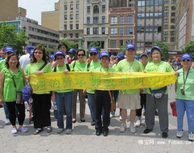 纽约青年佛教通讯中心的约50位成员,集体身着象徵环保的绿色上衣,在队伍中显得尤为醒目,右二为韦琪主任。