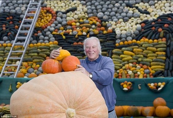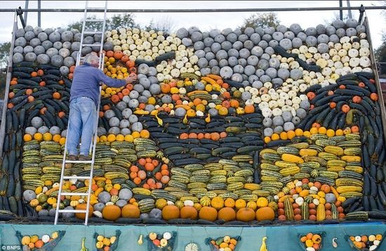 在斯林顿村,制作这种高难度的瓜果壁画是一项传统,至今已有43个年头。今年的壁画由65岁的罗宾厄普顿在其他10位村民的帮助下完成。这次,我们描绘了丰收的景象堆满瓜果的独轮车行驶在田间,明澈的天空里还有雄鹰在飞翔,罗宾说,跟过去一样,瓜果壁画十分受欢迎,它将一直展示到11月中旬。