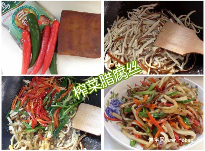 做法:腊豆腐切成丝,青红辣椒去蕊也切丝备用。锅里放油,先把豆腐丝放入榨至金黄色,放入乌江榨菜翻炒,适量放点盐,继续放入青红辣椒丝,炒至八成熟后撒入香葱即可。