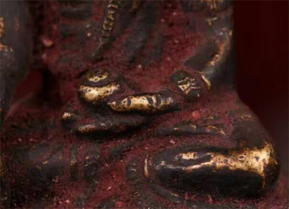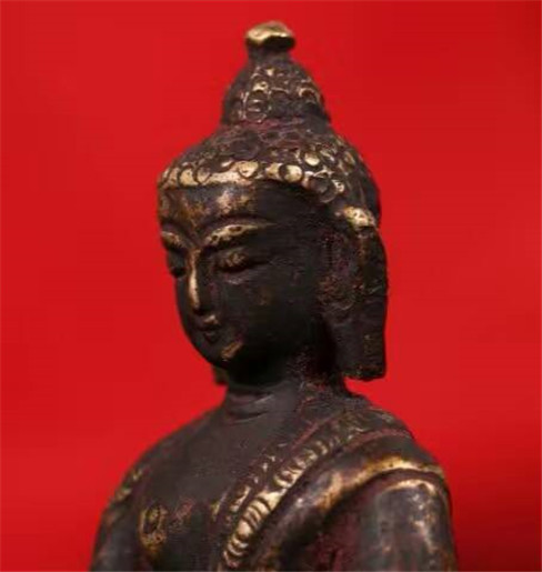 【坛城藏品介绍】尼泊尔回流清代药师佛◆【数据】高8.0cm宽5.5cm【描述】合金铜材质,供奉百年,包浆厚重,皮壳氧化极美,原生态收回,底座原封,朱砂供奉,开脸非常有神韵。