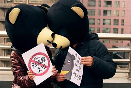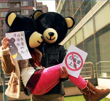请给我没有伤害的情人节2月14日,情人节下午,北京街头一组充满爱的行为艺术吸引了来往行人的眼球,一对对情侣穿着可爱的月熊装,手持请给我没有伤害的情人节的设计卡片。表演者说:每一个节日我们都应该与所有生命分享,这才是真正的快乐。在您送出玫瑰之前,请为苦难中的动物朋友做一次宣传,为TA们的未来增加一线希望之光。历史会证明,残害动物获取金钱利益,是在做着一件多么愚蠢和愧对后代的事。