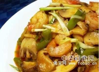 3、平底锅中放少量油,油烧热后,先爆炒胡萝卜、再放青椒、蒜苔丝、翻炒几下,再加入焯水后的蘑菇,按口味加入咖喱、再加入一匙酱油,用盐和糖调味后、用淀粉水勾芡即可盛盘。