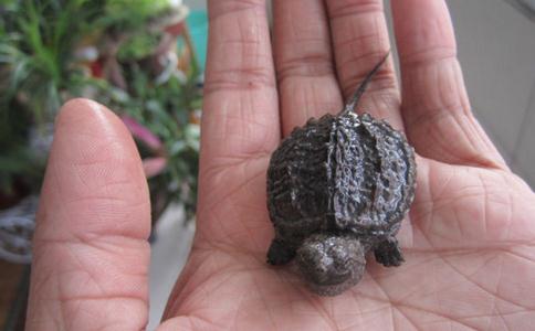 大鳄龟特征:真鳄龟长相酷似鳄鱼,集龟和鳄鱼于一体,故称真鳄龟。其头部较粗大,不能完全缩入壳内,脖子短而粗壮,领背长有褐色肉刺,眼细小,嘴巴上下颌较小,吻尖,尾巴尖而长,两边具棱,棱上长有肉突刺,尾背前边三分之二处有一条鳞皮状隆起棱背,并呈锯齿口状,背壳很薄,上皮以棕褐色为主,偶尔棕黄色,背部具有三条模糊棱,并有放射状斑纹,后缘呈齿状,腹部白色,偶有小黑斑点,幼时黑色,四肢粗壮,肌肉发达,爪子尖而有力,善于爬行。