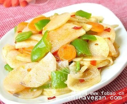 3、锅里放入油,到6分热,加入胡萝卜翻炒20秒;然后放入山药翻炒20秒,再加入青椒翻炒 倒入步骤(2)的调料,炒到收汁即可。