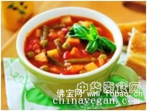 材料:4杯素高汤、4 杯切好的番茄、1 茶匙切碎的新鲜罗勒、1/2茶匙切碎的新鲜牛至、1 杯切好的胡萝卜、1 杯切好的芹菜、半个切碎的洋葱、1 杯切好的笋瓜、1 杯切好的黄南瓜、1 杯切好的四季豆、2瓣大蒜(切碎)、1 片月桂叶、适量盐和黑胡椒粉、1 杯半干的通心面