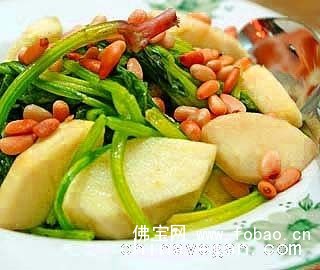4、在锅内放少许橄榄油,放菠菜、苹果块下去炒一会儿,然后加盐、蘑菇精调味。