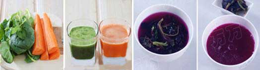 材料:绿菠菜,红色胡萝卜、深红色的紫苋菜、颜色非常深黄的老南瓜。