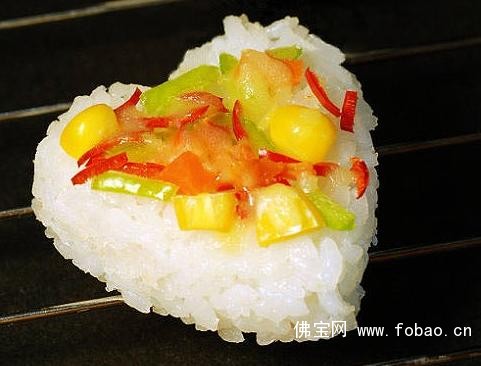原料:米饭200g盐3g青椒20g,红椒20g,胡萝卜20g,玉米粒20g,素起司20g。