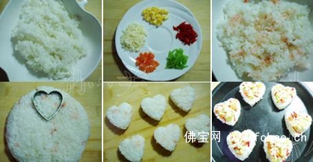 3、放在保鲜膜上,用保鲜膜将米饭包起,压实整形,然后取来一个心形的模具,压入米饭中,做出规则的心形。