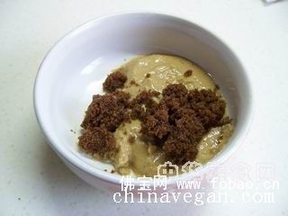 6、 打好的芝麻酱很浓稠,加入红糖和水,边加水边用筷子搅拌,调制成稍稀的酱。