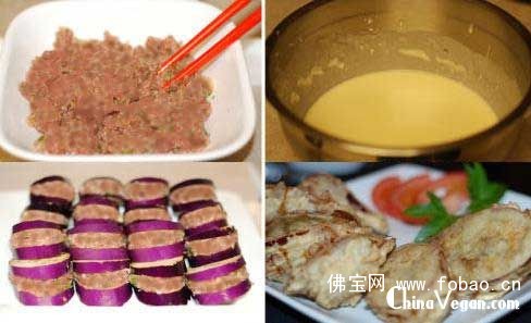 2、茄子洗净,去皮,从中切1~2刀,不可切到底,片片相连,在两片茄子中间抹入内馅。
