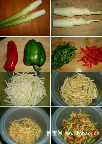 1. 将茭白洗净去皮切丝备用;将青椒和红椒切丝备用,将姜切成细丝备用;