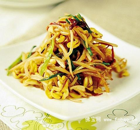 材料:黄豆芽450克、干辣椒15克、葱30克、盐适量、糖1/2茶匙(3ml)、油