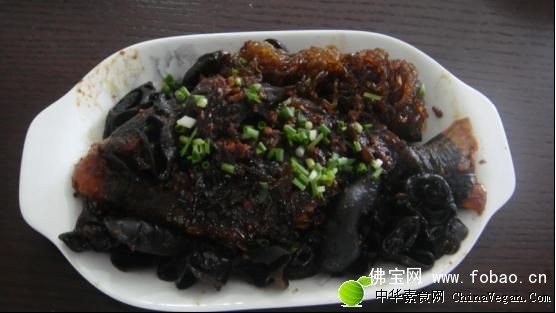 4、把素鱼再次回锅,加入酱油、糖、盐,翻炒,让素鱼两面吃入酱油约半分钟后倒入烧好的粉条和黑木耳,翻炒至酱油收干;喜欢加素易鲜的人可以加入1/4小调羹的素易鲜;