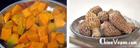 1.羊肚菌用清水浸泡2小时,沥水切开。南瓜去皮切成2厘米见方的小丁。