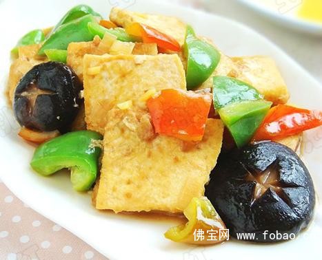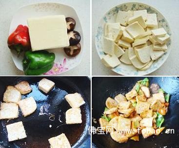 4、另起锅,或锅中留底油,加入适量清水,再加入酱油,白糖,盐调味,待水煮沸,放入红椒,青椒,及香菇,豆腐块,用中小火煮熟,最后用水淀粉勾芡即可,喜欢吃辣的还可以在芡汁里加入些辣椒。