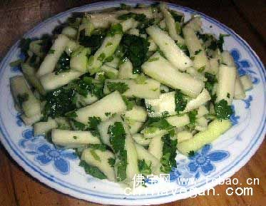 做法:1、茭白洗净、切条状,入开水焯烫熟;香菜洗净切段;
