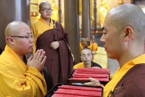 所谓“筹”其实是一种特制的小木棍,和筷子一般大小。开始的时候两个人先行一遍“香汤”,每个人先用“香汤”洗过手,然后行筹。这两个人一个人端着一个放满“筹”的盘子,另一个人则端着一个空盘子,先走到香案前,给本师释迦牟尼佛敬第一支筹,说:“岁次某甲年,夏三月安居会上,娑婆教主本师释迦牟尼佛,受第一筹。”表示佛陀的法身和我们一起在安居,摄持僧团如法安居修道。然后从师父开始,依次行筹到最后一人,到沙弥都完全行完后,再到韦陀菩萨前面,为韦陀菩萨敬上最后一筹:“岁次某甲年,夏三月安居会上,护法韦陀尊天菩萨,受最后筹。”表示韦陀菩萨也和僧团一起参加安居,护持僧团违缘、魔障消除,顺利安居。到此时,受筹才结束,然后拿着盘数筹,数出参加安居的比丘和沙弥各自的数量,报云:“岁次某甲年,夏三月安居会上,现受筹者,比丘有若干人,沙弥有尔许人。”