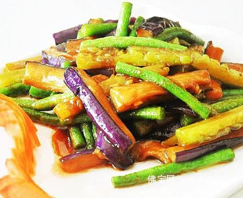 将茄子切成条状放入油中炸至金黄色捞出备用,苦瓜切成条状、豆角切成段,原材料分别飞水,另起锅放入少许油加入姜末煽出香味加入原材料煽炒加入调味料加少许水,稍煮一下勾少许芡汁淋上香油出锅装盘既可。