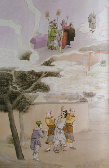 吴越王信仰佛教,深知他盗用库钱,全在放生。因此命执行刑罚官,在临刑时,注意观察他的言词容色,前来禀报。大师身临刑场,脸上毫无忧戚的表现,大家都觉得很奇怪,大师说:‘我对库钱,毫无私自使用,全部买物放生,如今死了,直生西方极乐世界,岂不是一大乐事?“吴越王听了他的话,就赦免了他的罪。大师从此出家为僧,勤修禅定,礼佛拜忏,获得无碍辩才。