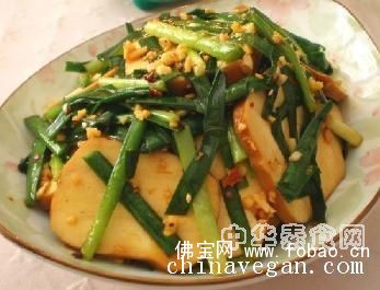 1、韭菜择洗干净后沥干;素鸡洗净后切成片,生姜与大蒜切成末;