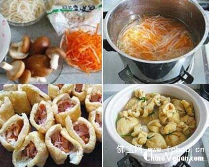 原料:豆皮包16只、素肉馅180克、莲藕1大节、胡萝卜1根、鲜香菇12朵、姜5片、香葱若干、素高汤700ml、盐少许、生抽1小匙