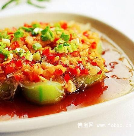 4、丝瓜筒捞出,码在盘子里,将粉丝先铺在丝瓜上,再均匀的铺上调好的蒜蓉酱;