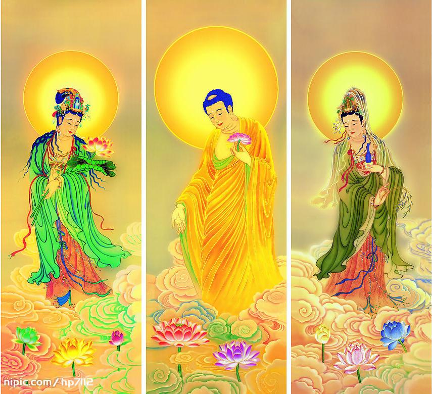 阿弥陀佛成道之本缘,据无量寿经卷上载,过去久远劫世自在王佛住世时,有一国王发无上道心,舍王位出家,名为法藏比丘,于世自在王佛处修行,熟知诸佛之净土,历经五劫之思虑而发殊胜之四十八愿。此后,不断积聚功德,而于距今十劫之前,愿行圆满,成阿弥陀佛,在离此十万亿佛土之西方,报得极乐净土。迄今仍在彼土说法,即净土门之教主,能接引念佛人往生西方净土,故又称接引佛。阿弥陀三尊像通常以观音菩萨及大势至菩萨为其胁侍,而与此二尊并称为西方三圣。
