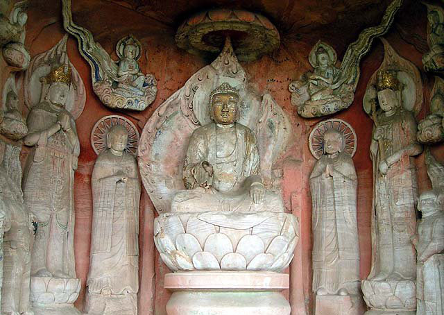 两边分别还有大势至菩萨、观音菩萨、阿难、迦叶像。两位菩萨的衣饰给人以薄纱透体的感觉,十分精美。
