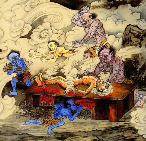 罪犯死后的十几天,刘差役,寒热交攻,病卧在床,自己在说胡话,说:‘某人在东狱大帝那里告发了我,即刻就要开庭审理。’接著又趴在床上大声哀号。自己说自己该死!接著又说:‘因我一惯说谎,要用铁钩,钩我的舌头…。’一会儿,刘差役的舌头就伸出来数寸长,然后自己用牙突然嚼自己的舌头,一嚼粉碎,满口血肉淋漓而死!