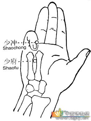按压心脏排毒要穴。这是指少府穴,位置在手掌心,第
