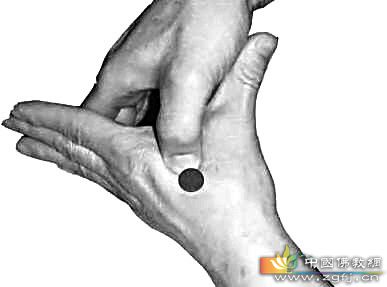 掌骨桡侧的中点处,可以用拇指和食指捏住这个部位,用力按压。