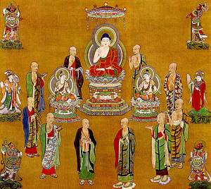 一天,太子禀明父王,要到城外出游。净饭王便敕令官属前后导从,陪同太子出城-这时途中观者如云都想看看太子的风采。太子乘车到了东门,于人丛中看见一个老人,发白面皱,骨瘦如柴。手持拐杖,行动极其困难。车经南门,又看见一个病者,身瘦腹大,喘息呻吟。痛苦万状的在道旁挣扎。后来到了西门,遇到一族人抬着一具尸体。那尸体脓血流溢,恶臭难闻。随行的亲属,痛哭流涕,使睹者心酸。太子看到此等情状,真是感慨万分。想到世人不拘富贵贫贱,都逃不过老病死的大关,乃叹道: