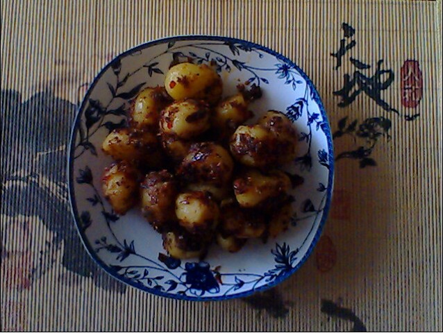 3、倒油,放几颗花椒、老姜(切成颗粒状)、和豆瓣(用中火,注意不要把豆瓣炒糊),翻炒一会后,把土豆倒锅里翻炒,把土豆表面炒出薄薄的一层锅巴。