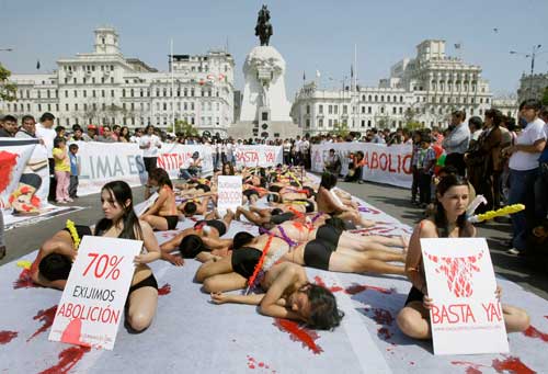秘鲁反斗牛人士前天在首都利马示威,要求停止举行斗牛活动。他们把白布摊在利马大街上,以红漆代替血液,然后躺在白布上,象征着斗牛活动夺走的人命。秘鲁的斗牛活动已有数百年历史,当地还拥有一座建成于17