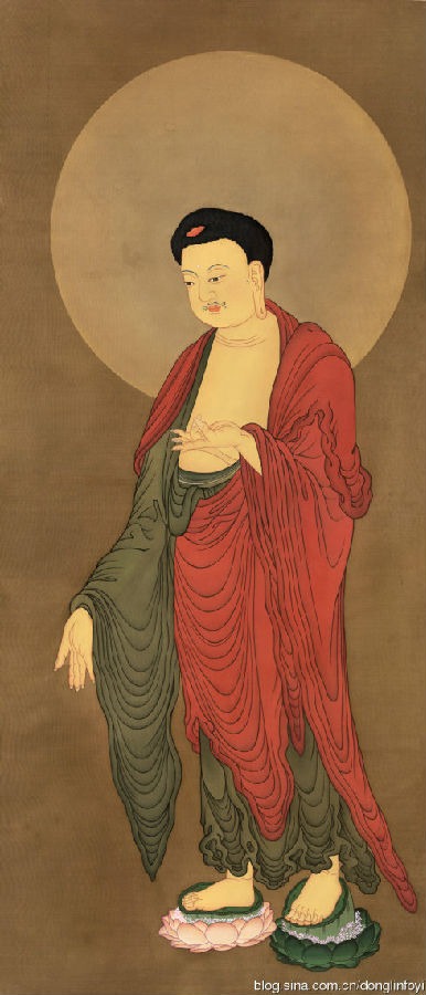又刘程之居士,居山精修念佛法门,始涉半载,即于定中见佛光照地,皆作金色。居十五年,于正念佛中,见阿弥陀佛玉毫光照,垂手慰接。程之曰:“安得如来为我摩顶,覆我以衣?”俄而佛为摩顶,引袈裟以披之。