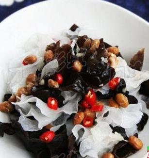 材料:泡发黑木耳50克、泡发银耳50克、纳豆1小盒、绿芥末适量、生抽适量。