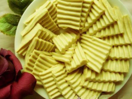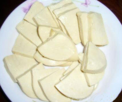 4、加压时间到,拿掉纱布即可切片摆盘,直接食用或蘸自己喜欢的蒜茸、番茄酱、香辣酱等,也很好吃。