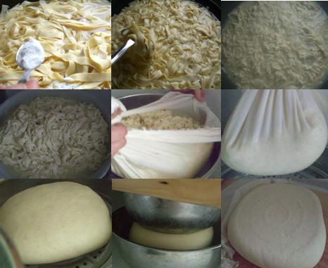 3、盆内放白钢帘子,上面铺纱布,然后倒入熬好的干豆腐,沥干水份,拧紧纱布四角然后口朝下扣在帘子上,然后上面加压重物定型(我用盛满水的盆压上然后压菜板上面还可加压,越重越好)加压2-3小时即可。
