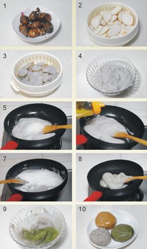 材料:芋头500克(约用320克芋头馅)、抹茶粉、糖、色拉油适量、澄面(这些材料适量,是因为要根据个人口味加糖,并且根据芋泥的湿度调整澄面的分量。所以灰就不具体写多少了。总之,馅料一定要干,干!)