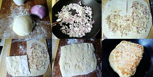 5、把炒好的洋葱碎均匀的铺在上面,留一块面皮不要放,把这块面皮折叠下来。
