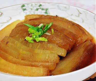 1、冬瓜去皮洗净,切成几大块,如沸水中煮透,晾凉。均匀的抹上一层甜面酱,晾干。