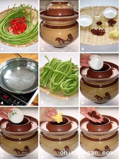 材料:瘦豇豆1大把,朝天椒1小把,泡菜坛子一个,盐150克,冰糖或白糖20克,花椒5克,草果1粒, 八角3粒,生姜1块,清水适量(根据坛子大小)