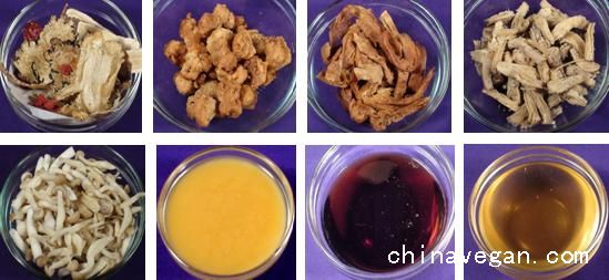 姜母ㄚ中药材50元、素肉块200公克、皮丝200公克、无蛋无奶香菇头200公克、 鸿喜菇200公克、冷冻姜汁200CC、黑麦汁1/2杯(可无)、白麦汁1杯(可无)(见下图)