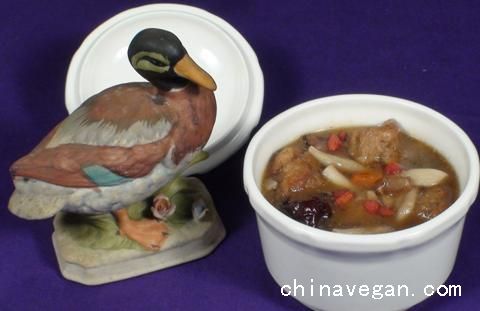 2、加入素肉块、皮丝、无蛋无奶香菇头、鸿喜菇或自己喜欢的食材煮约5分钟。